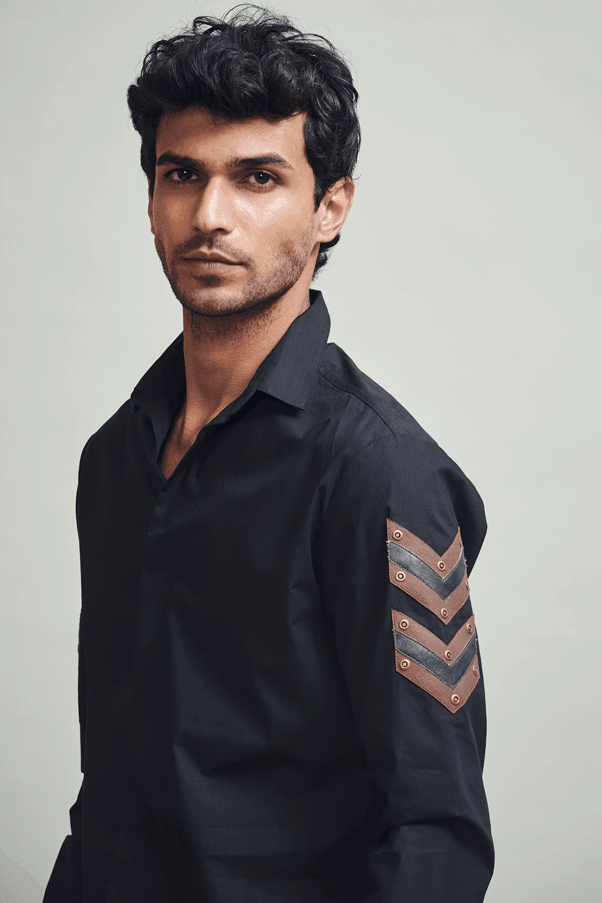 Army inspired patches in faux leather and metallic rivets on either sleeve. Concealed buttons. Regular fit poplin shirt.