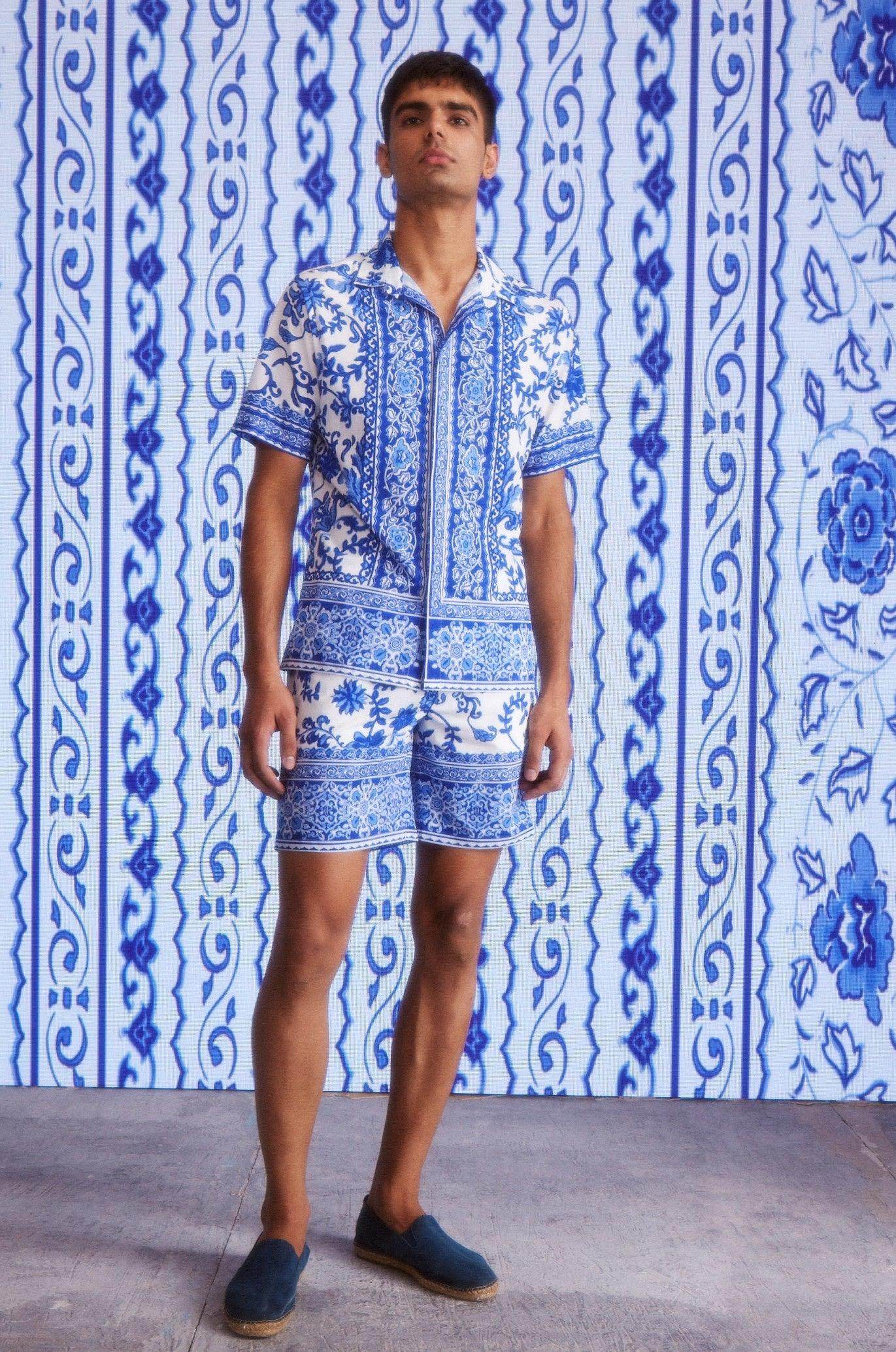 Blue on white floral ceramic inspired printed coord set. Placed borders around the center placket, sleeves cuff and the bottom hem of the shorts. Button-down half sleeve shirt with a concealed placket. Paired with matching shorts. Semi-elasticated at the waist, pockets on the side and back. Zip fly.
