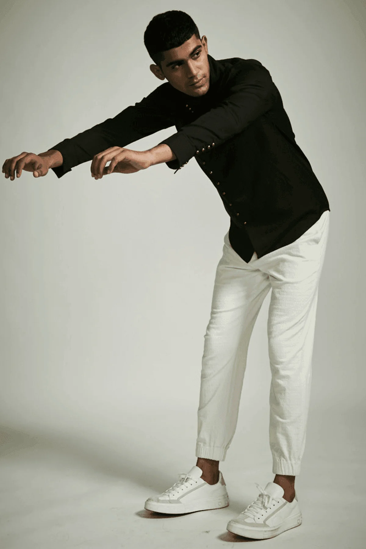 High neckband collar. Exaggerated antique finish shank buttons on the collar, placket, and cuff. Regular fit.